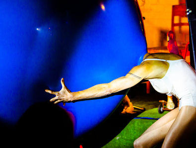 Failing to be remotely sexy, despite effort, Charlie climbs into a giant balloon dressed in unflattering lingerie whilst singing. She hops, bounces and splits about before emerging in a glamorous evening dress.